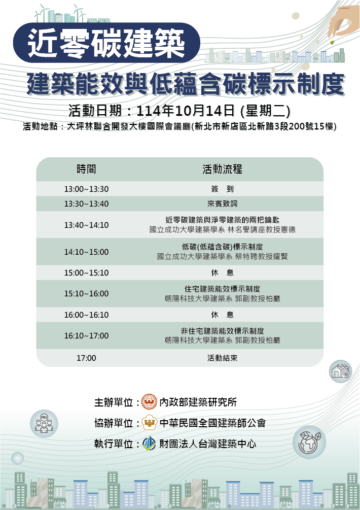 本所訂於114年10月14日假大坪林聯合開發大樓15樓國際會議廳,舉辦「近零碳建築:建築能效與低蘊含碳標示制度」培訓活動,分別為:「近零碳建築與淨零建築的兩把鑰匙」、「低碳(低蘊含碳)標示制度」、「住宅建築能效標示制度」及「非住宅建築能效標示制度」等4項主題,期待在公私協力與全民參與的共同努力下,逐步推動建築產業邁向國際化,同時擴散淨零建築的理念與實質影響。